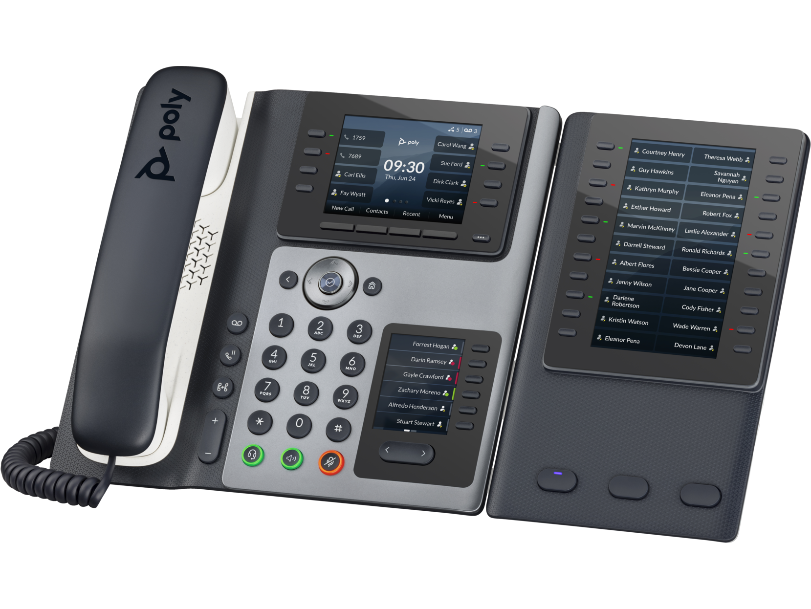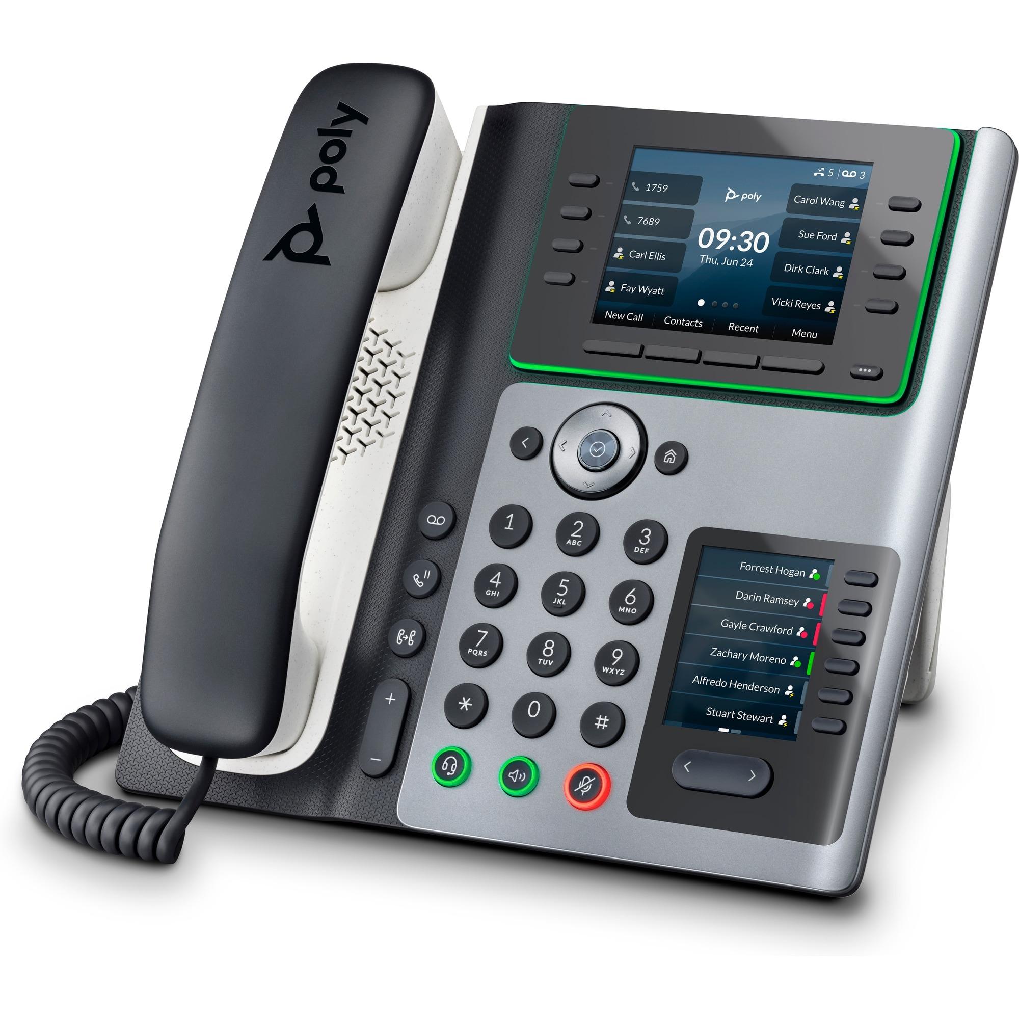 Poly Edge E Series phones with Poly Voice Software (PVOS) are desktop phones with bright colour displays that provide superior HD (High Definition) audio with Poly signature NoiseBlockAI and Acoustic Fence features.