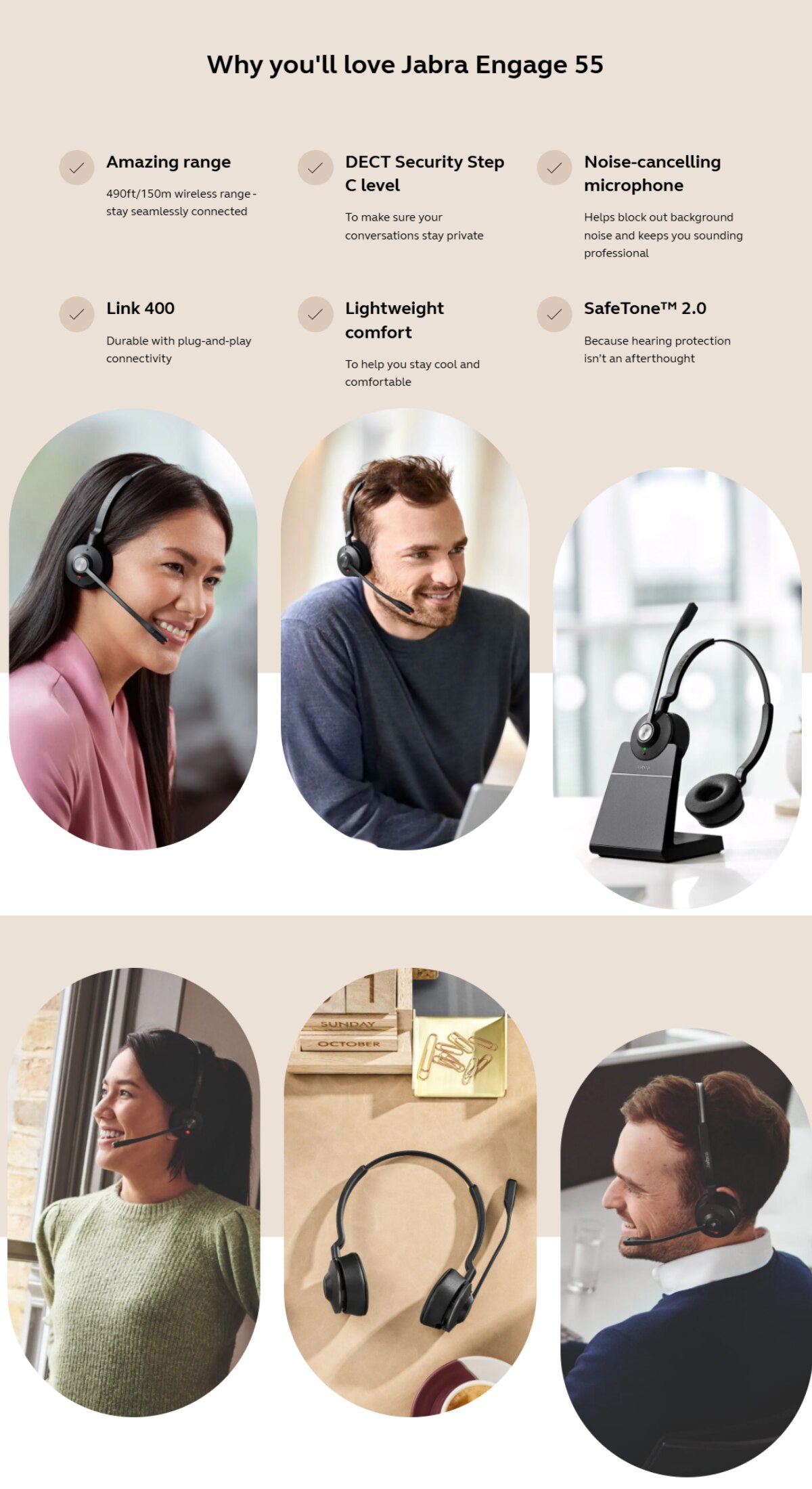 - Box contentEngage 55 Stereo & MonoHeadset, USB adapter, USB cable, travel pouch, safety information and warrantyEngage 55 ConvertibleHeadset with ear hook, USB adapter, USB cable, travel pouch, safety information and warranty, headband, neckband, and eargels