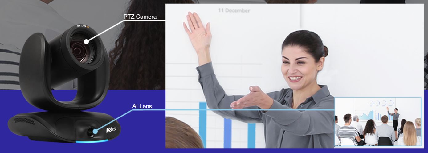 - Dynamic auto framing: secondary AI lens detects all participants, new participants trigger PTZ lens to dynamically frame all participants.
