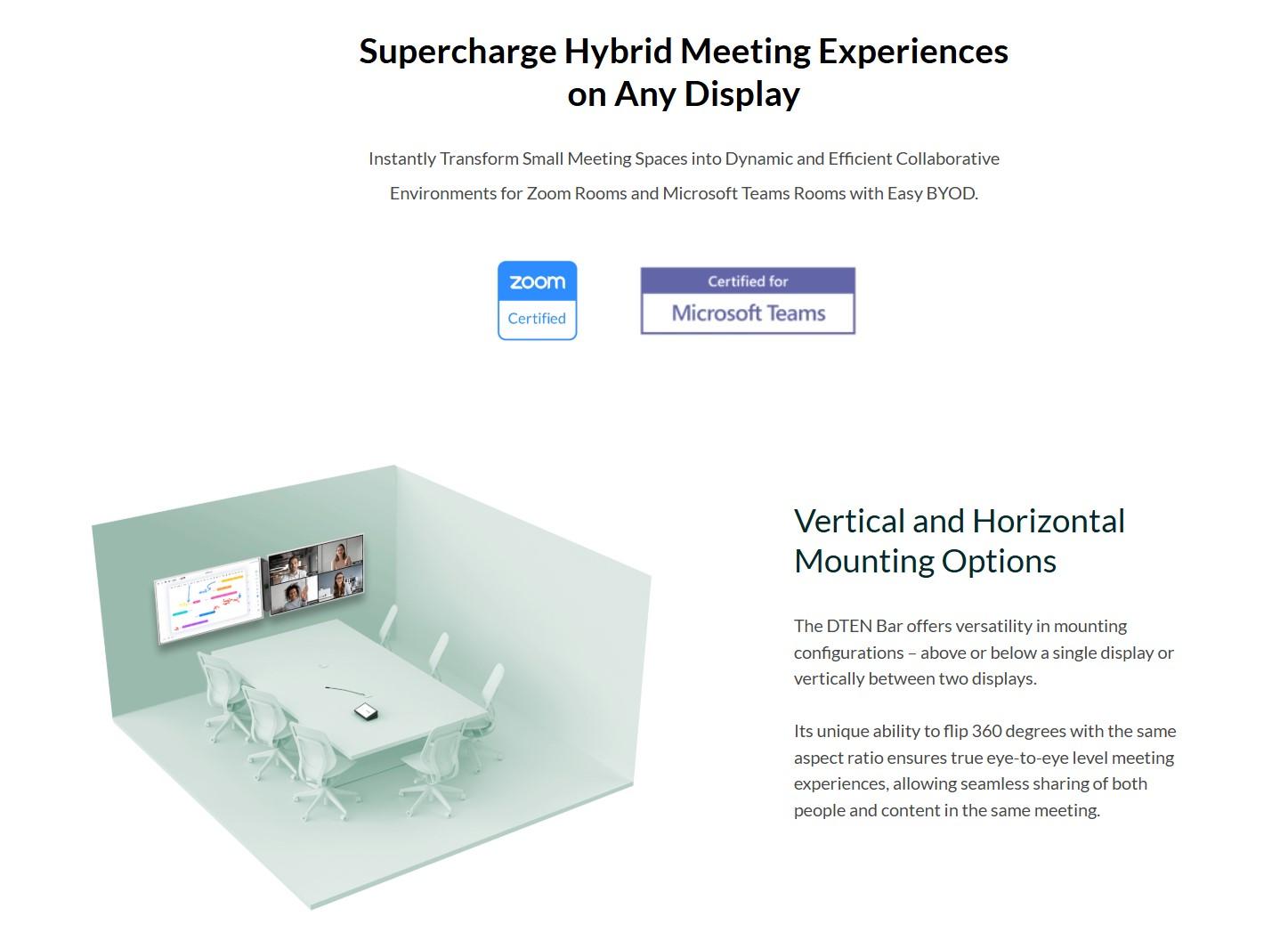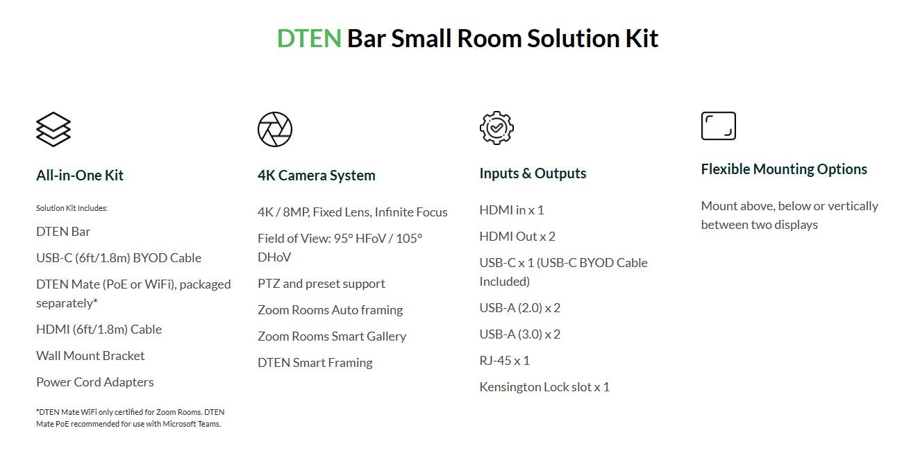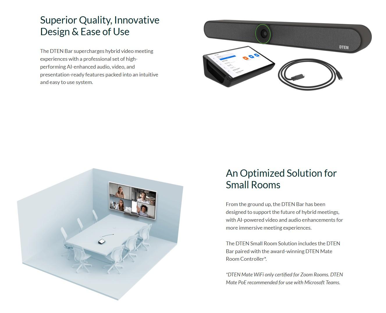 DTEN DCR200-Kit1SPMEC DTEN Bar with Mate (PoE) - Small Room Solution by Dten SKU: DCR200-Kit1SPMEC Please log in to see price or purchase this item Quantity discounts available QuantityPrice DescriptionDescription