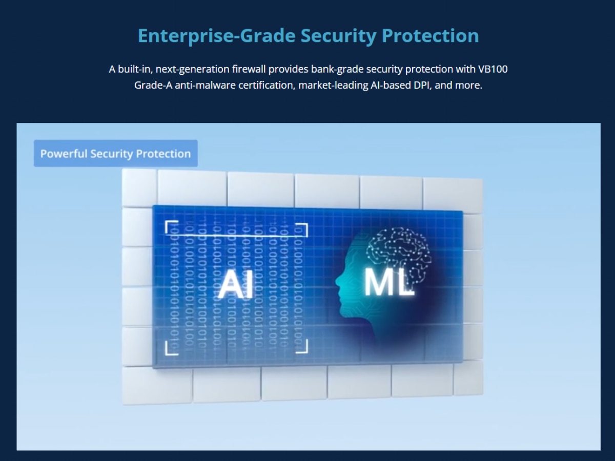 - Built-in firewall provides anti-virus, layer 3-7 IDS/IPS, DPI, SSL detection, and more