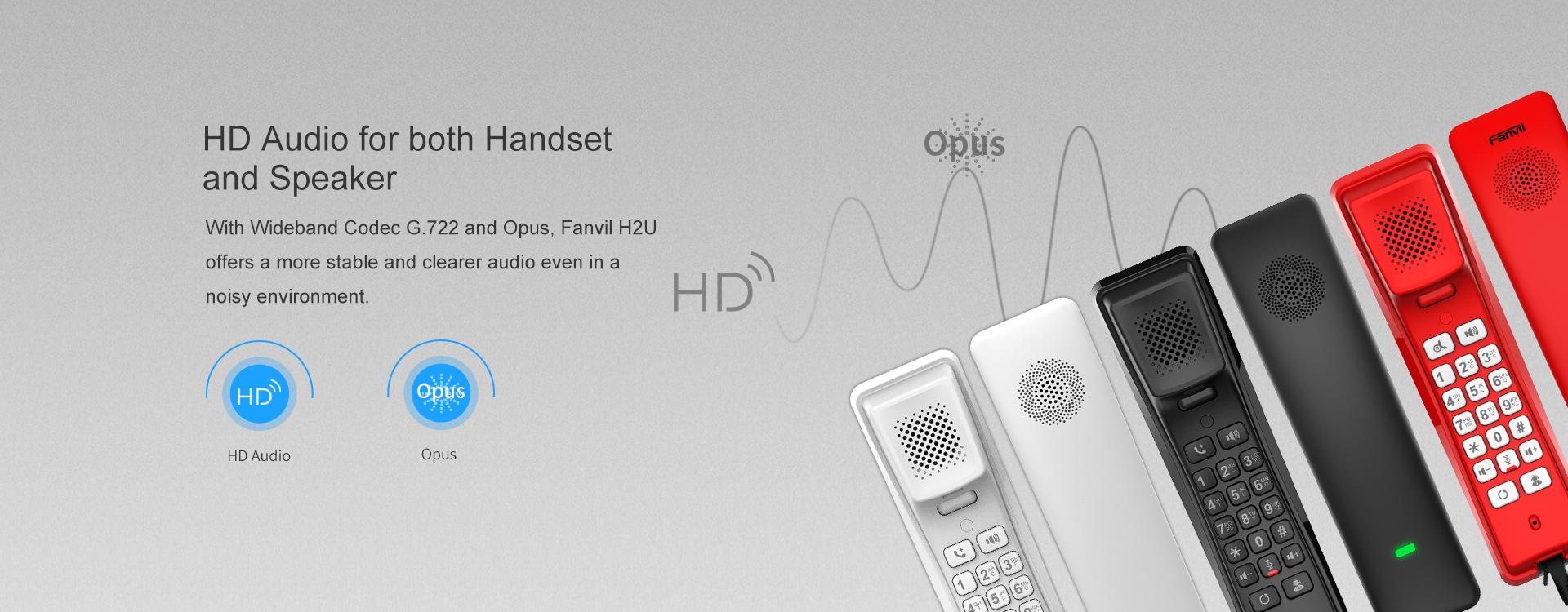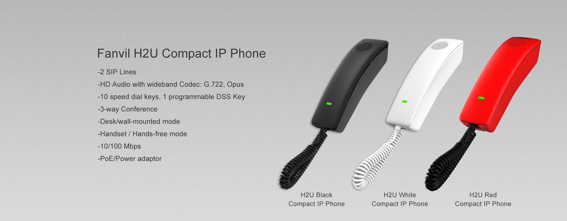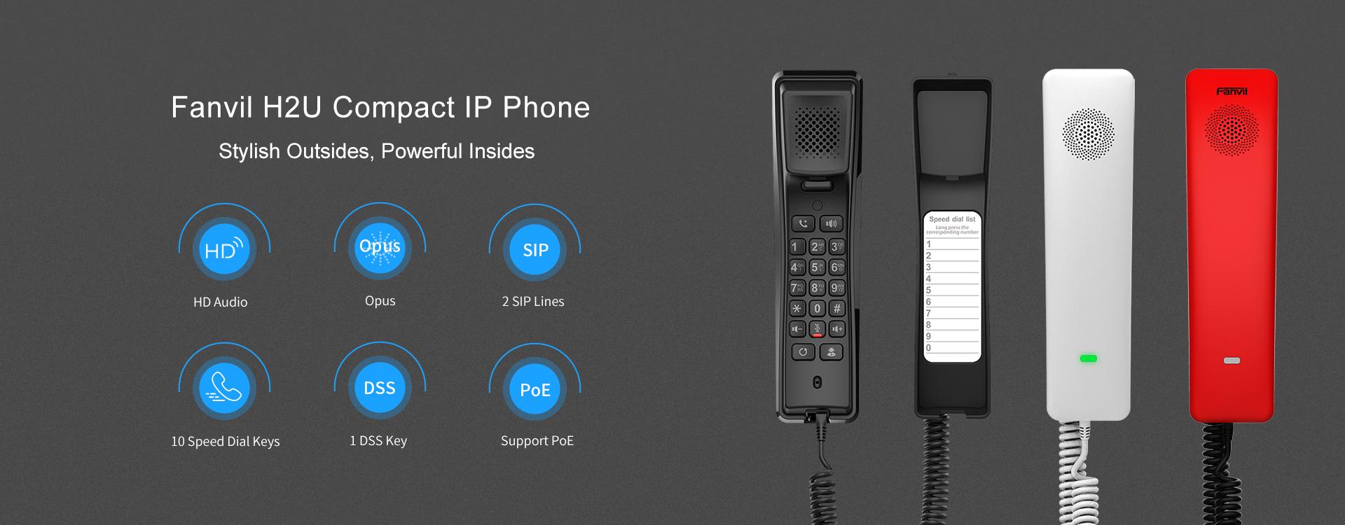 Tiny and stylish, Fanvil H2U compact IP phone possesses brand new features including 2 SIP lines, 10 speed dial keys, 1 programmable DSS key and a HD speaker on handset. Supporting desktop and wall-mounted mode, PoE and power supply charging mode, Fanvil H2U is more than a hotel phone and also can be applied in multiple scenarios, such as school, hospital, supermarket and residence.