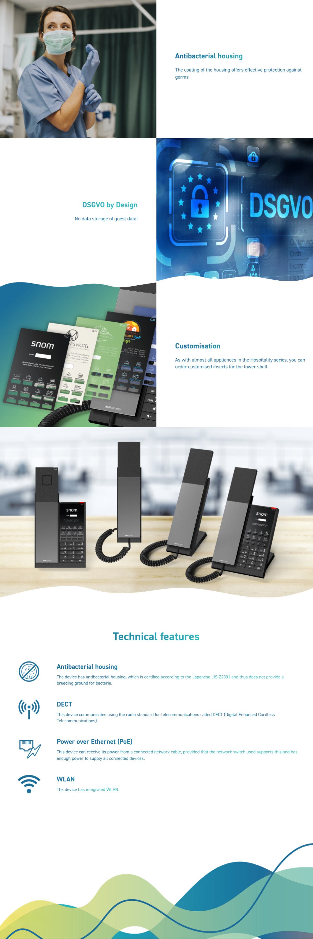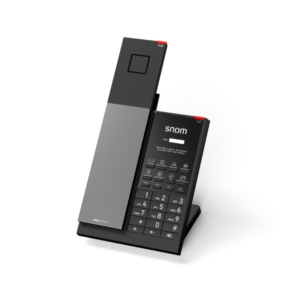 The control panel of the Snom HD351W is particularly easy to read, clearly designed and has the most important features for the comfort of your guest: hands-free, mute and hold calls are integrated, individual key functions can be stored! The HD351 has an antibacterial housing to protect against germs and is easy to clean. A large visual indicator alerts the guest to calls or waiting messages. The HD351W has a base station for up to 5 handsets for maximum flexibility and freedom of movement. Individualised labelling is provided as an insert on the control panel. Operation also possible via PoE!