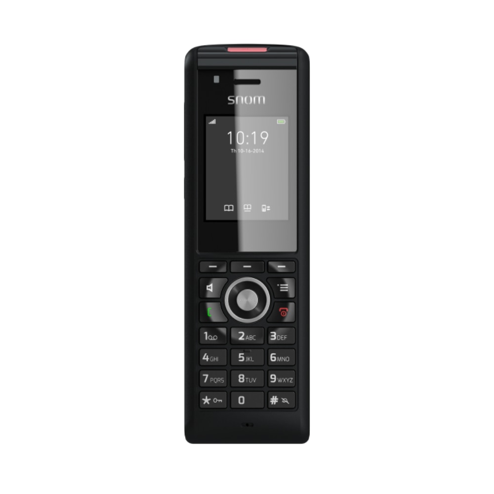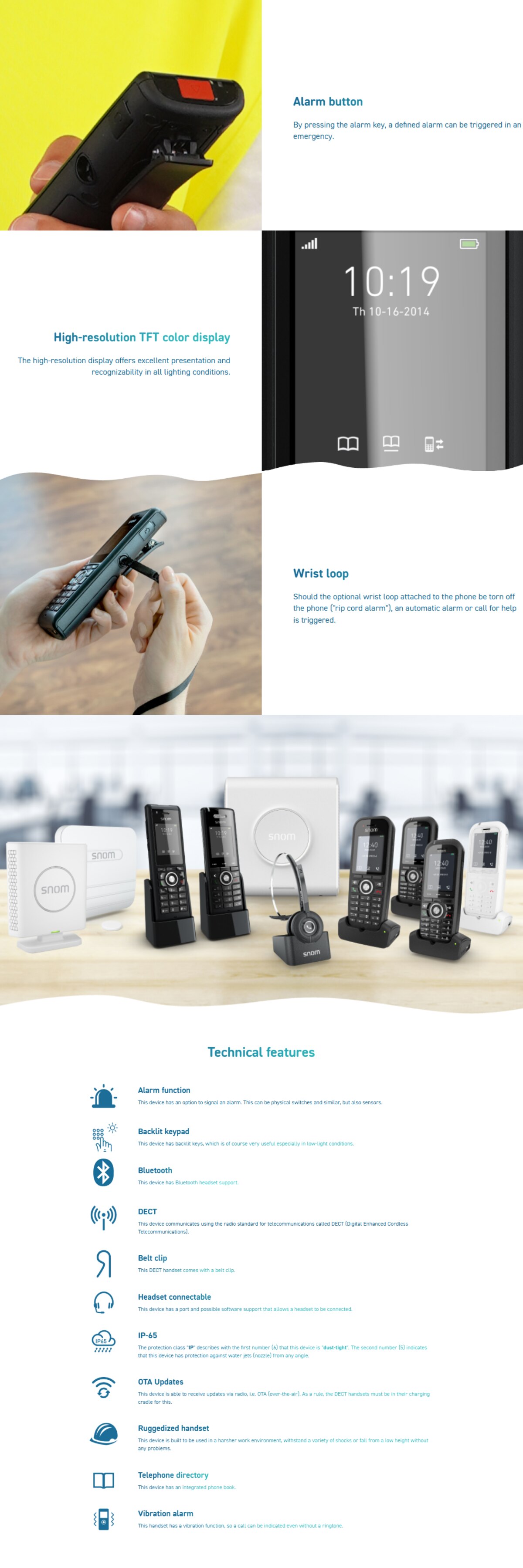 - Programmable "push button alarm" via alarm button: The Snom M85 has a freely programmable alarm button. Depending on the programming, pressing this button can send a message (messages are sent and received via compatible alarm servers) or an automatic call for help to any phone number.