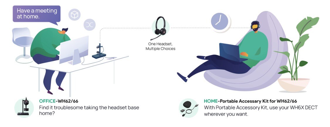 The Portable Accessory Kit can quickly help you out. Plug-and-play and lightweight, it turns your DECT Headset into a full-scenario solution—the best fit for today’s hybrid workers.