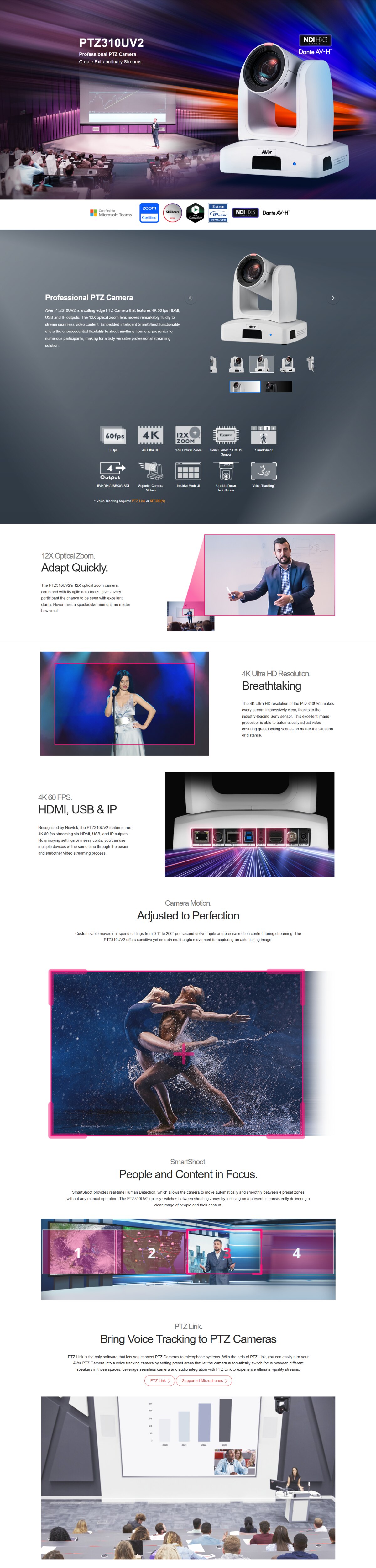 AVer PTZ310UV2 Professional 4K PTZ Camera White (12X Optical Zoom, 3GSDI, HDMI, IP, USB)** While Stocks Last ** by AVer SKU: PTZ310UV2 Please log in to see price or purchase this item Quantity discounts available QuantityPrice DescriptionDescription